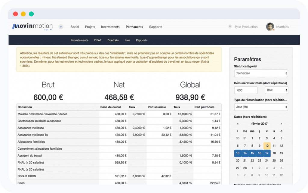 Movinmotion vous propose un estimateur de bulletin de salaire pour les intermittents du spectacle, entièrement gratuit dédié aux employeurs du secteur culturel. Ce simulateur vous permet de calculer les charges patronales et salariales, en se basant sur le salaire brut, net, ou sur le coût global employeur. Evaluez le coût d’un recrutement grâce à ce simulateur de bulletins de salaire qui affiche en temps réel une estimation du montant net et du coût global de l’intermittent du spectacle pour l’employeur. Cliquez ici pour estimer un bulletin de salaire !